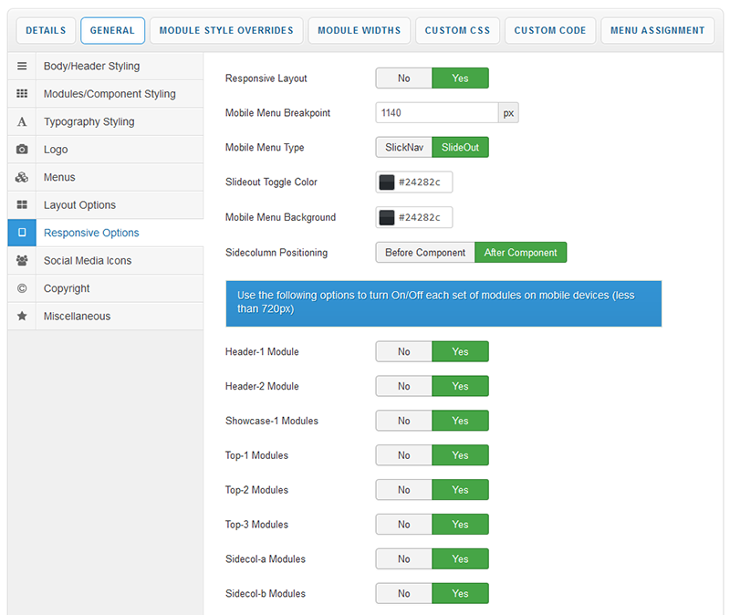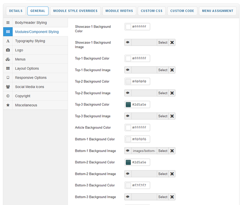 Module Style Overrides allow you to style individual module positions to your own taste. This greatly extends the control of how each of your module positions are displayed with a host of styling options including background image, background color, text color, heading color, button color and module padding. Multiple overrides can be created, each applied to the module position of your choice.