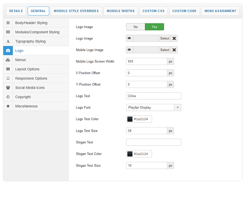 This section of the template parameters allows full control over your site logo with an array of easy to use options. Upload your logo image via the 'Select Logo Image' field and then use the X and Y axis field to tweak its position.