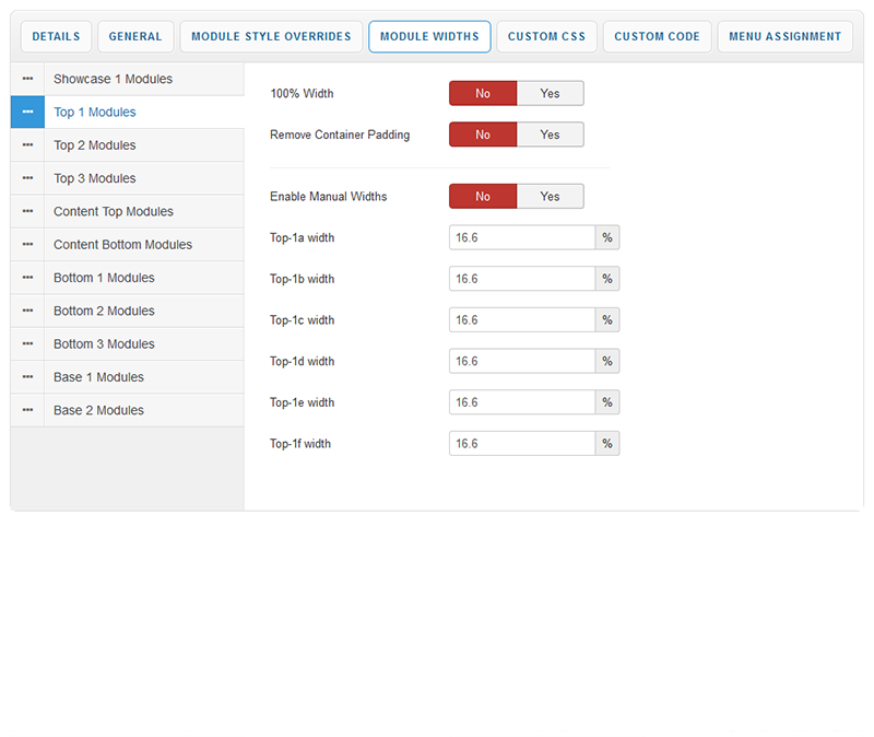 By default your module widths will automatically adjust depending on the number of modules published within its containing row. Via the Module Widths section of the parameters you can now disable this feature and customise the width of each individual module.