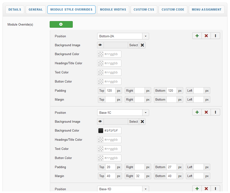 Module Style Overrides allow you to style individual module positions to your own taste. This greatly extends the control of how each of your module positions are displayed with a host of styling options including background image, background color, text color, heading color, button color and module padding. Multiple overrides can be created, each applied to the module position of your choice.