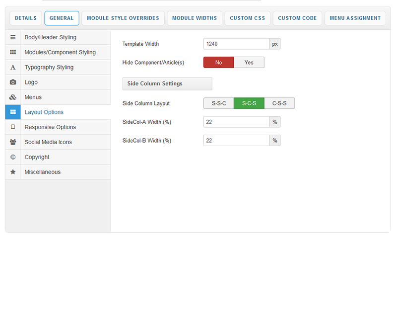 From your Layout Options you can set the layout of your side columns in relation to your site content with options for both your side columns to appear on either the left or the right or on either side of your content/component area. Width options are also available in this tab to edit the entire width of your template.